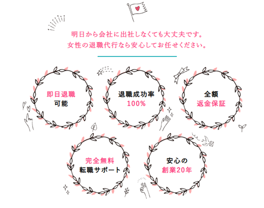 女性専門という安心感とスタッフの方が優しく対応してくれて「明日から仕事に行かなくても大丈夫ですよ」と言っていただけたので安心して任せられました。実際に問題なくすぐに会社を辞めることができました。今はとても良い会社に再就職できてすごく充実しています。