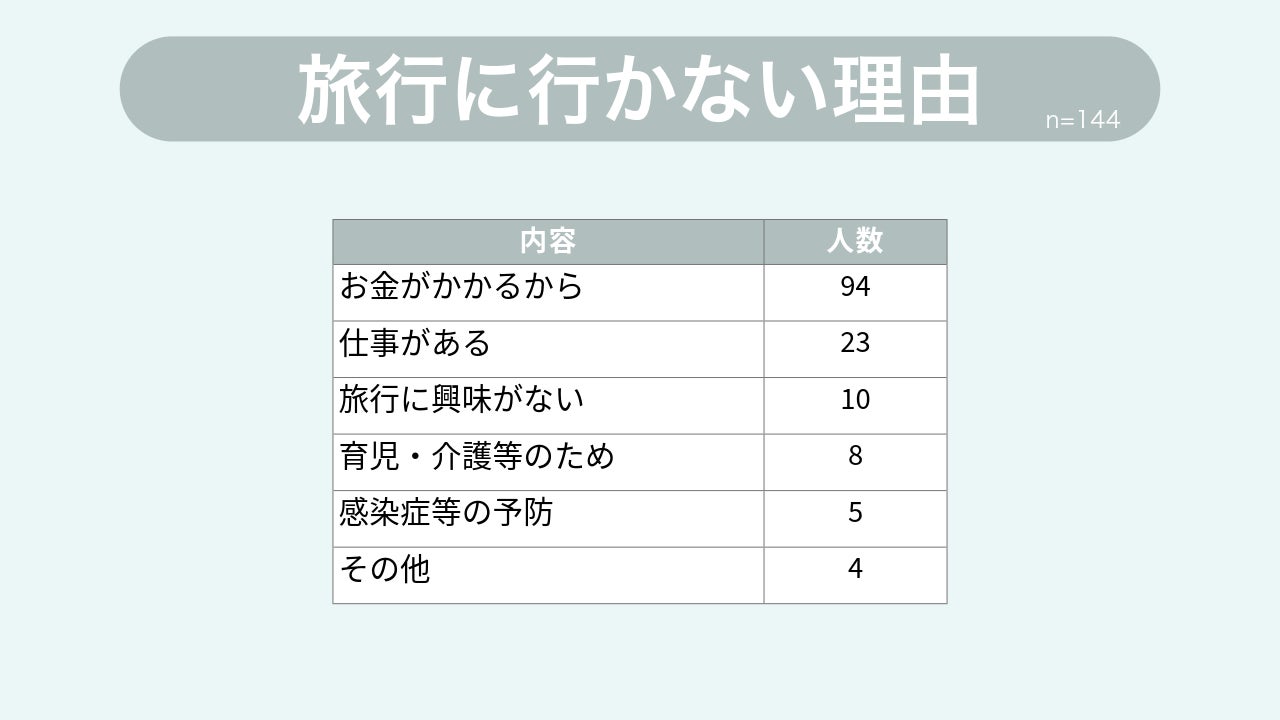 「あまり意欲がない」「行かない」と回答した144人に、旅行に行かない理由として最も当てはまる内容を聞いたところ、「お金がかかるから」94人(約65.3%)が圧倒的多数。