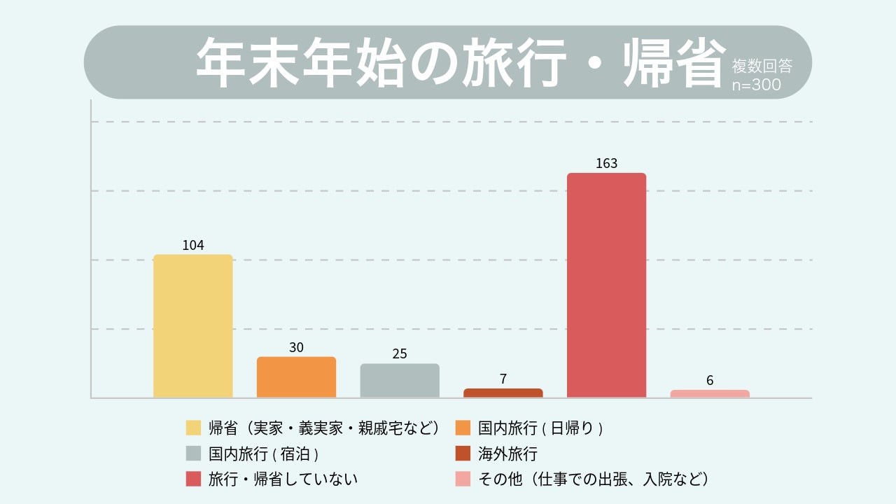 アンケートに回答した300名に年末年始期間(2024年12月28日~2025年1月5日)の帰省・旅行について質問したところ、最も多かった回答は「旅行・帰省していない」163人(約54.3%)でした。