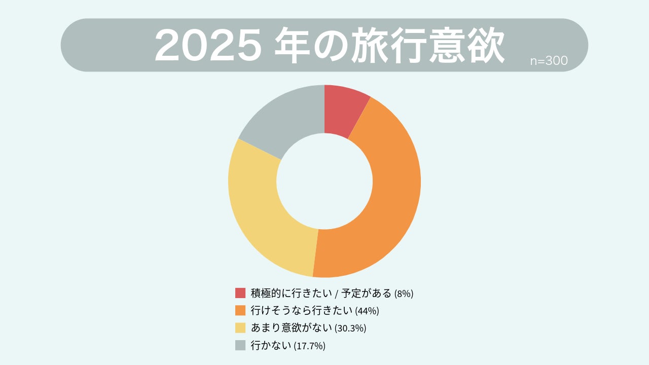 2025年のゴールデンウィークや年末年始など、長期休暇の旅行に関して「積極的に行きたい(または行く予定がある)」と回答したのは24人(約8.0%)とごく少数でした。