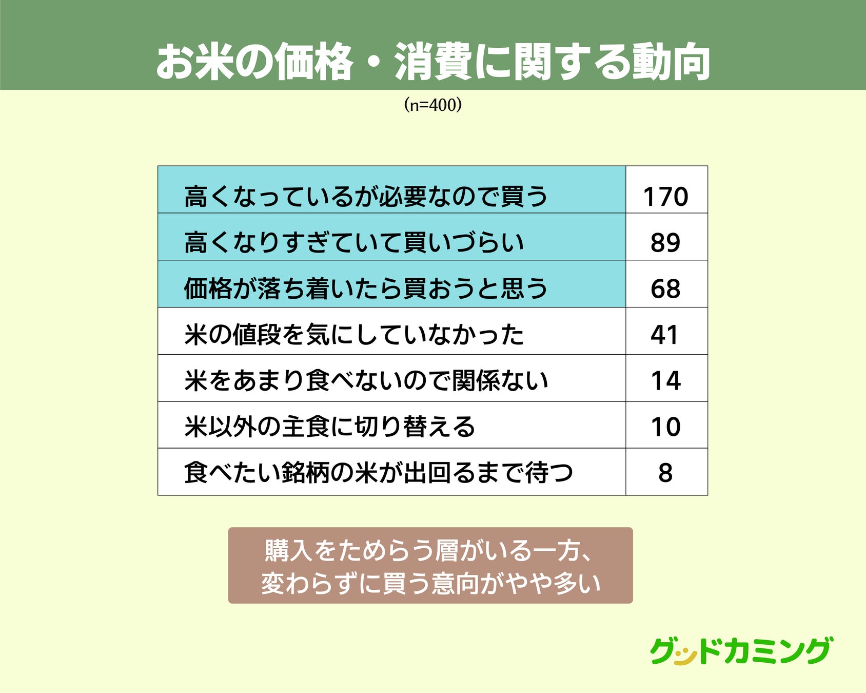 - 高くなっても米を買う意向の消費者が多数派だが、買い控えも目立つ