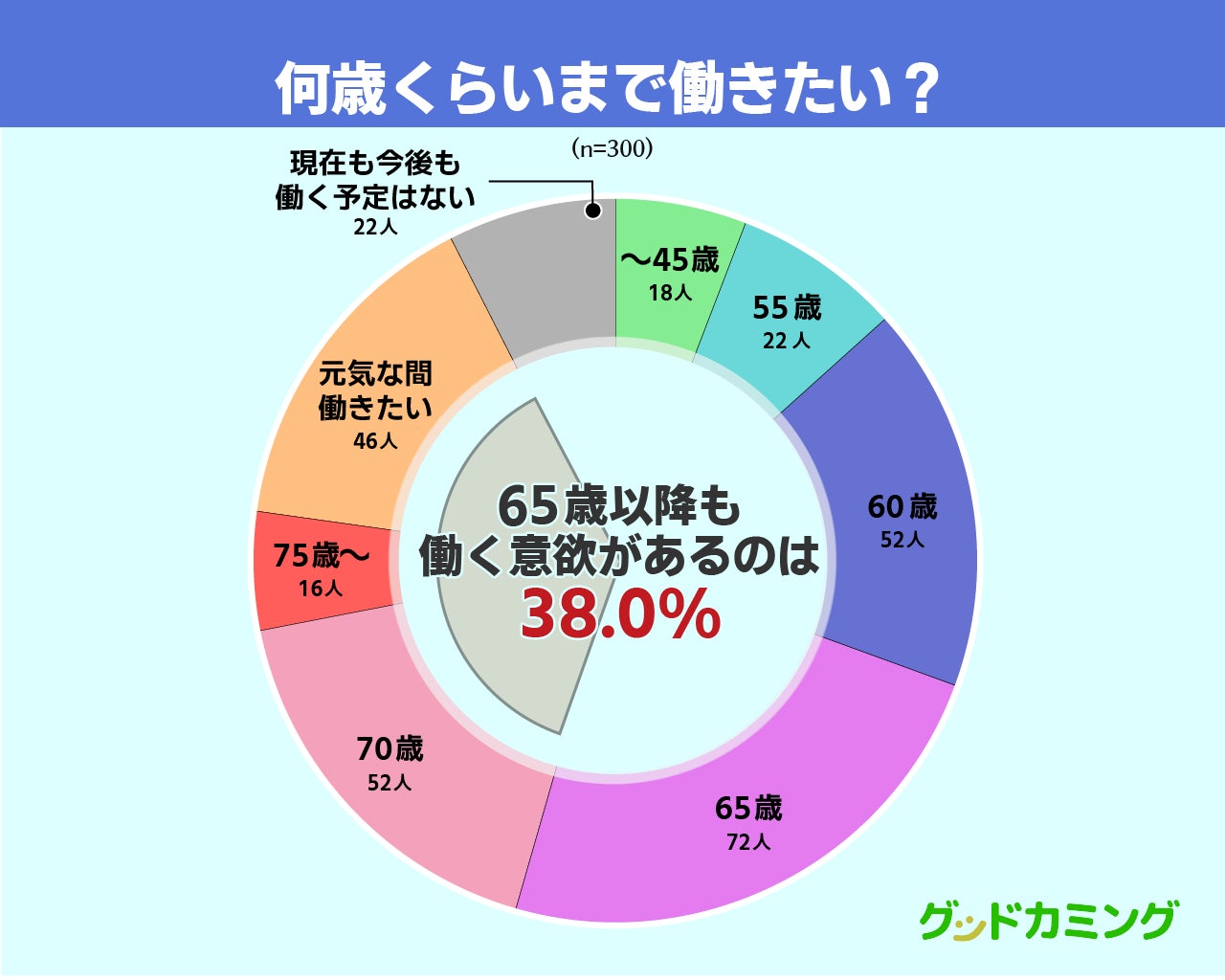 アンケート回答者に「何歳まで働きたいか」質問したところ、65歳以降も働きたいと回答したのは合計38.0%(114人)。
