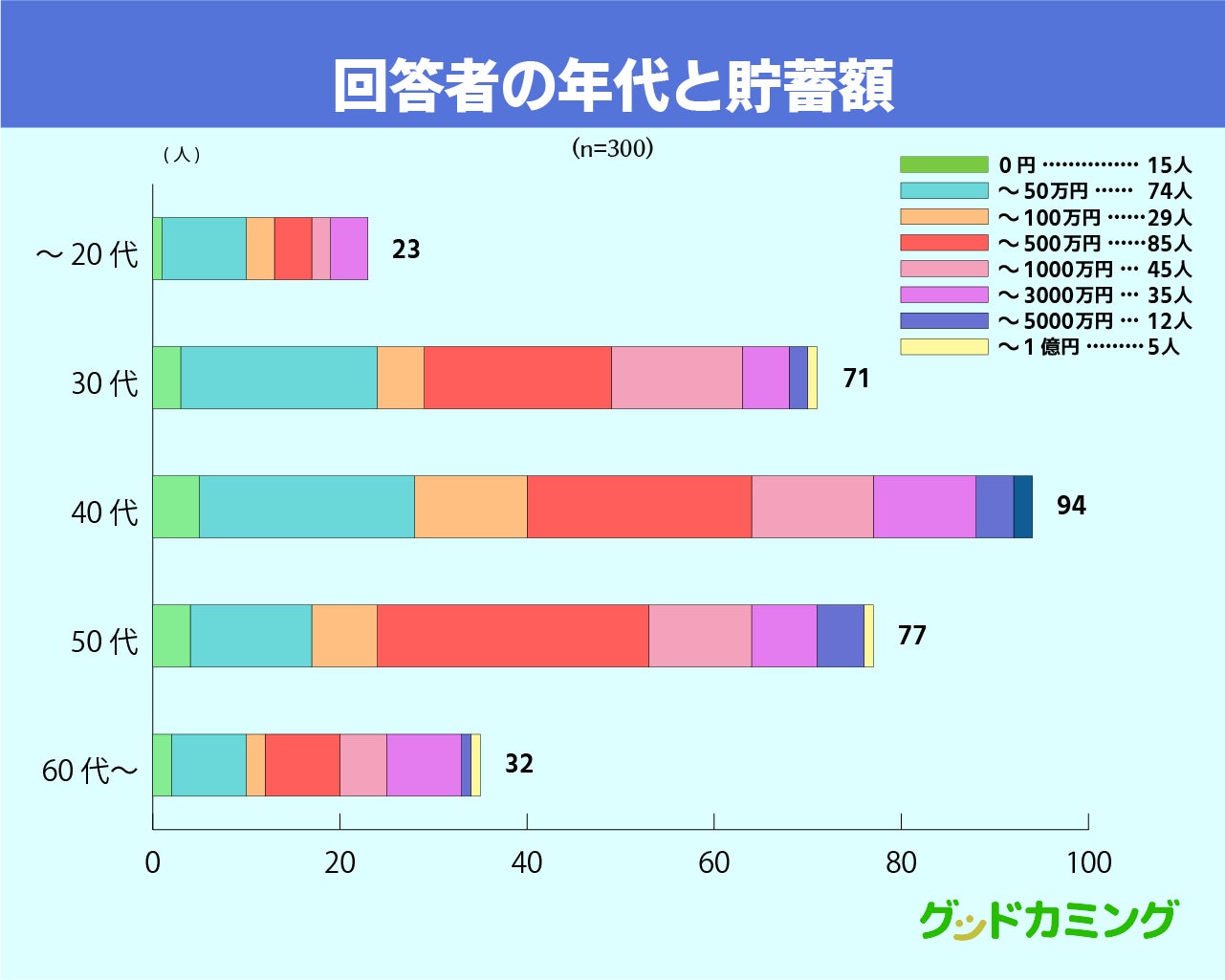 アンケートに回答した300名に対して、年代および貯蓄額について質問しました。