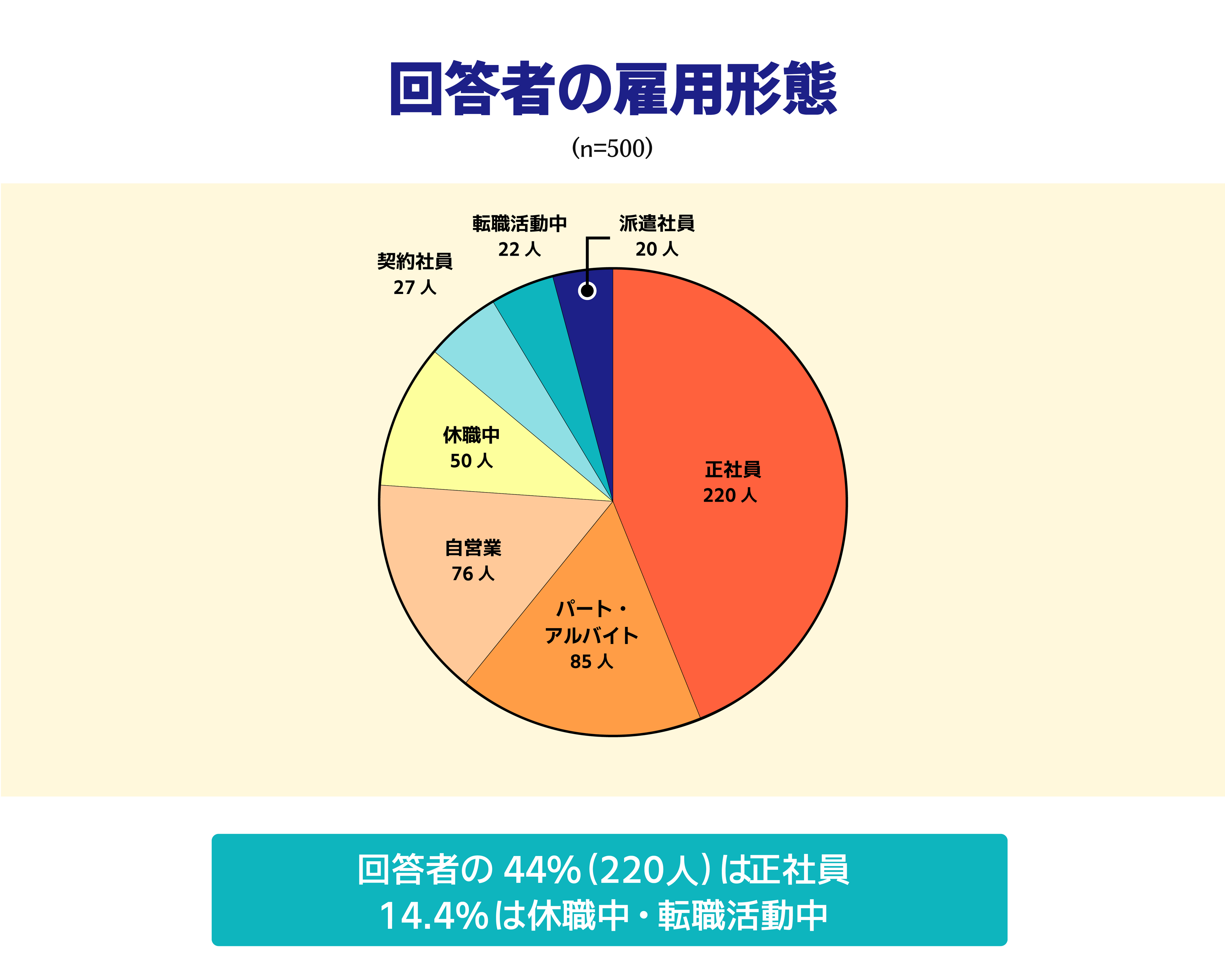 最初に回答者の雇用形態について尋ねたところ、44%(220人)が正社員で多数派、次いでパート・アルバイトが17%(85人)。