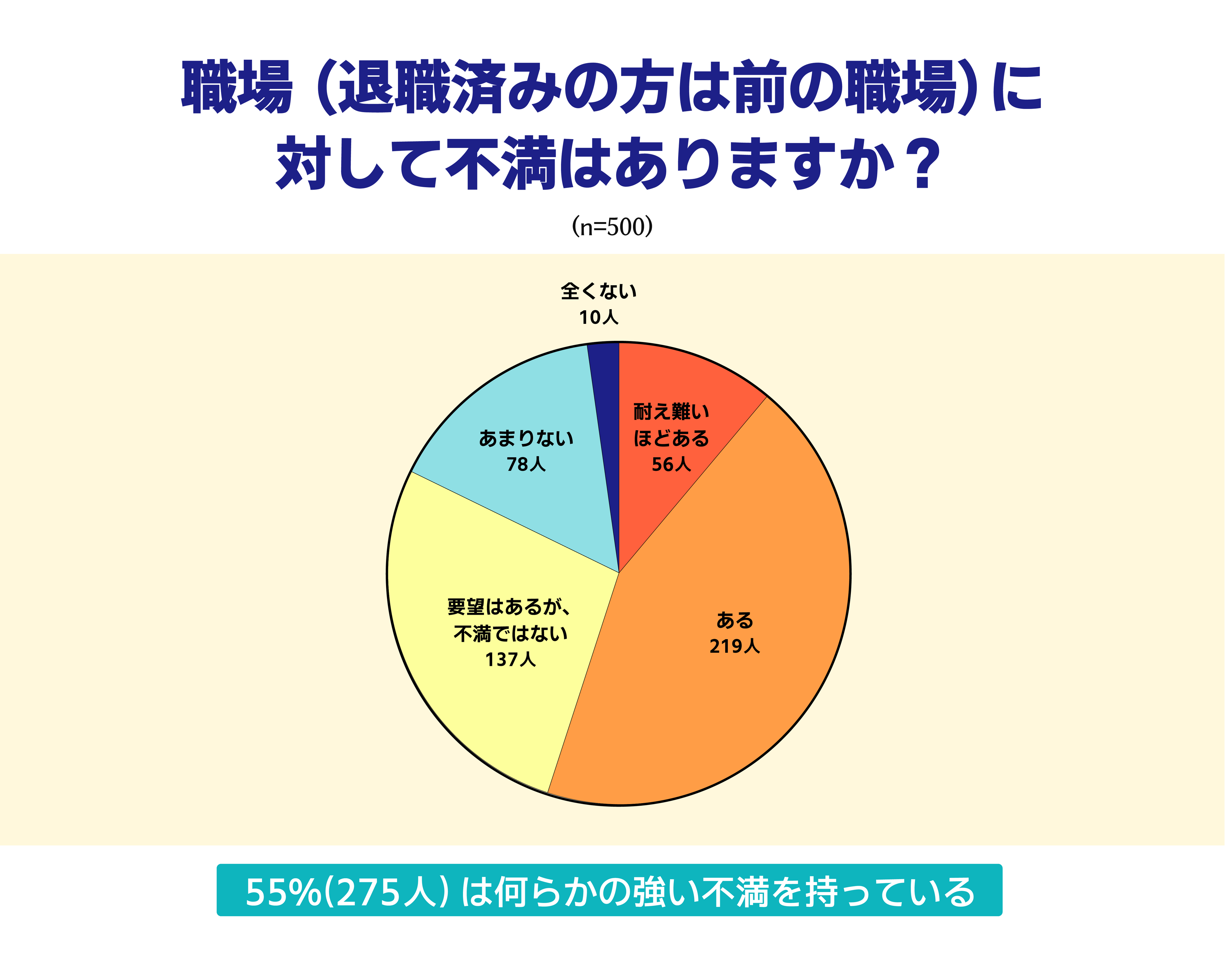 回答者500人のうち、「耐え難いほど不満がある」「不満がある」と答えた人は55%(275人)でした。