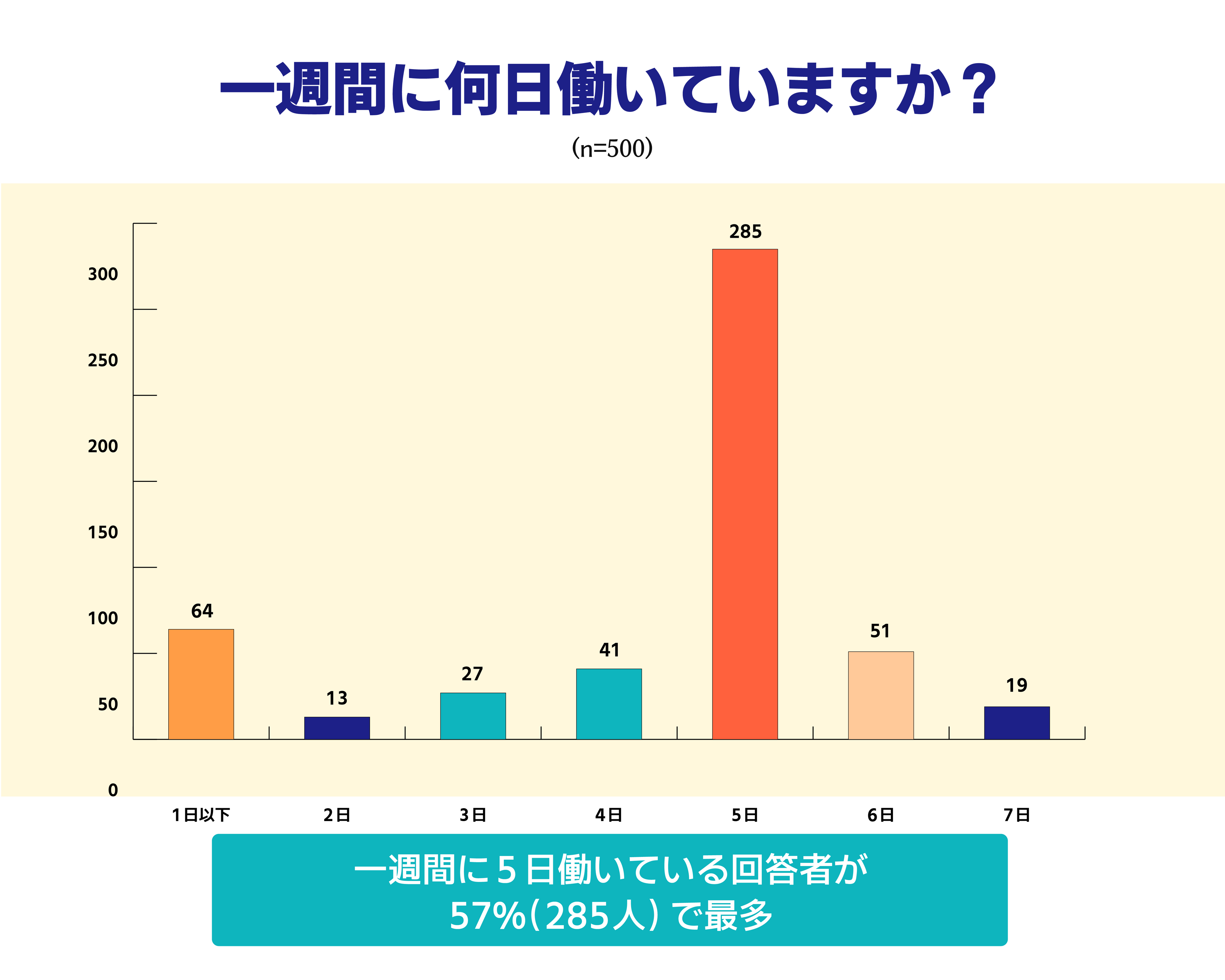一方で、週の休みが0~1日の回答者は14%(70人)にのぼり、週休3日で働く層8.2%(41人)を上回る結果となりました。