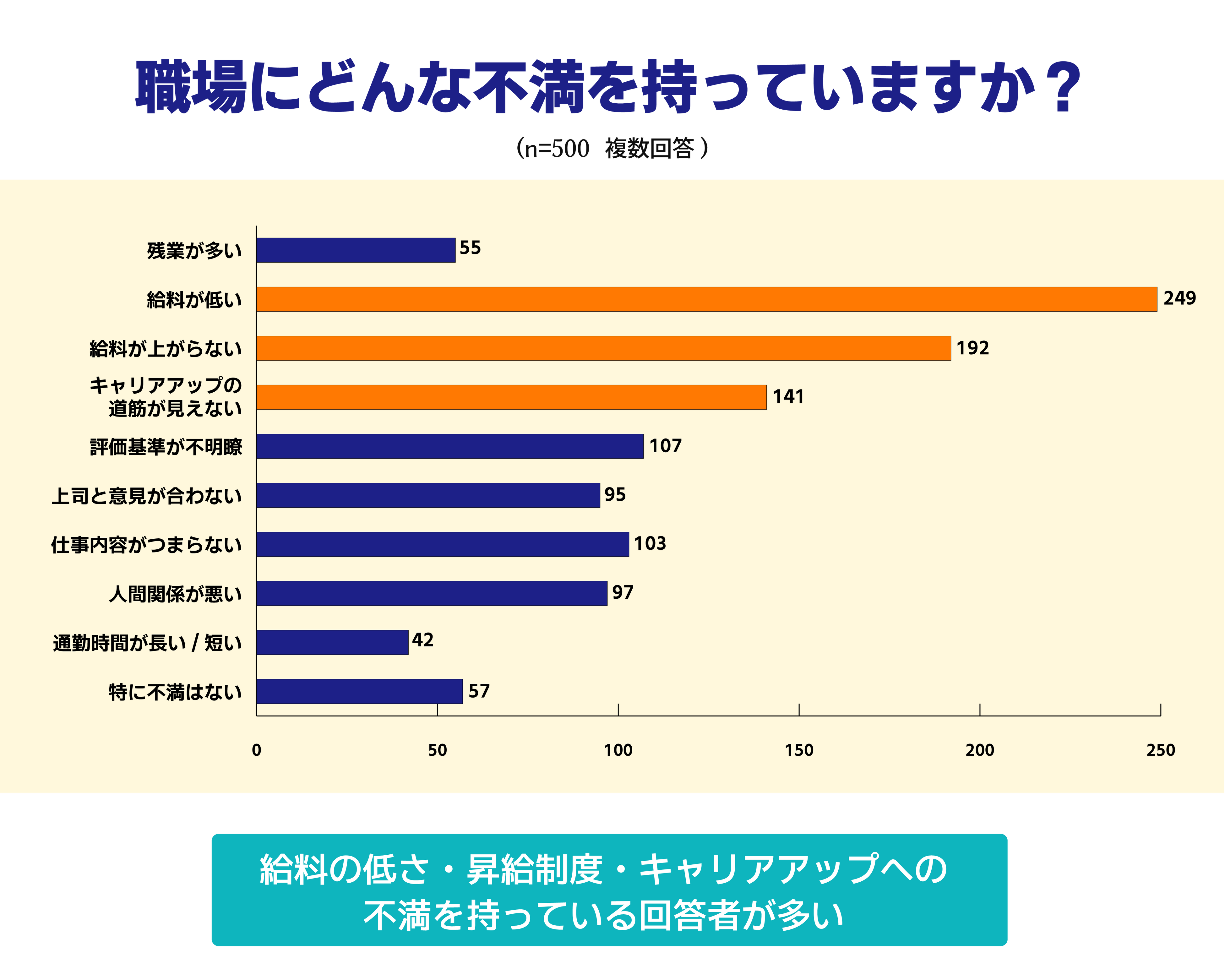 具体的な不満の内容として特に多かったのは「給料が低い」(249人)、「給料が上がらない」(192人)、「キャリアアップの道筋が見えない」(141人)。