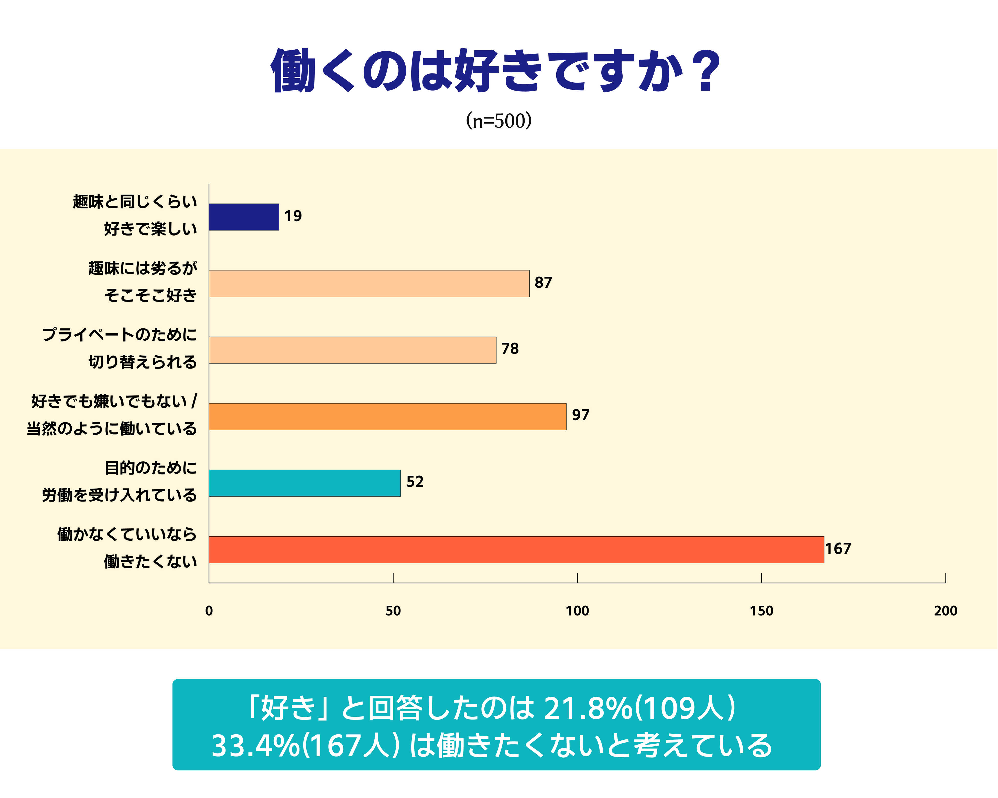 目的や仕事内容、賃金に関わらず、労働そのものを「好き」と感じている人の割合についても質問しました。