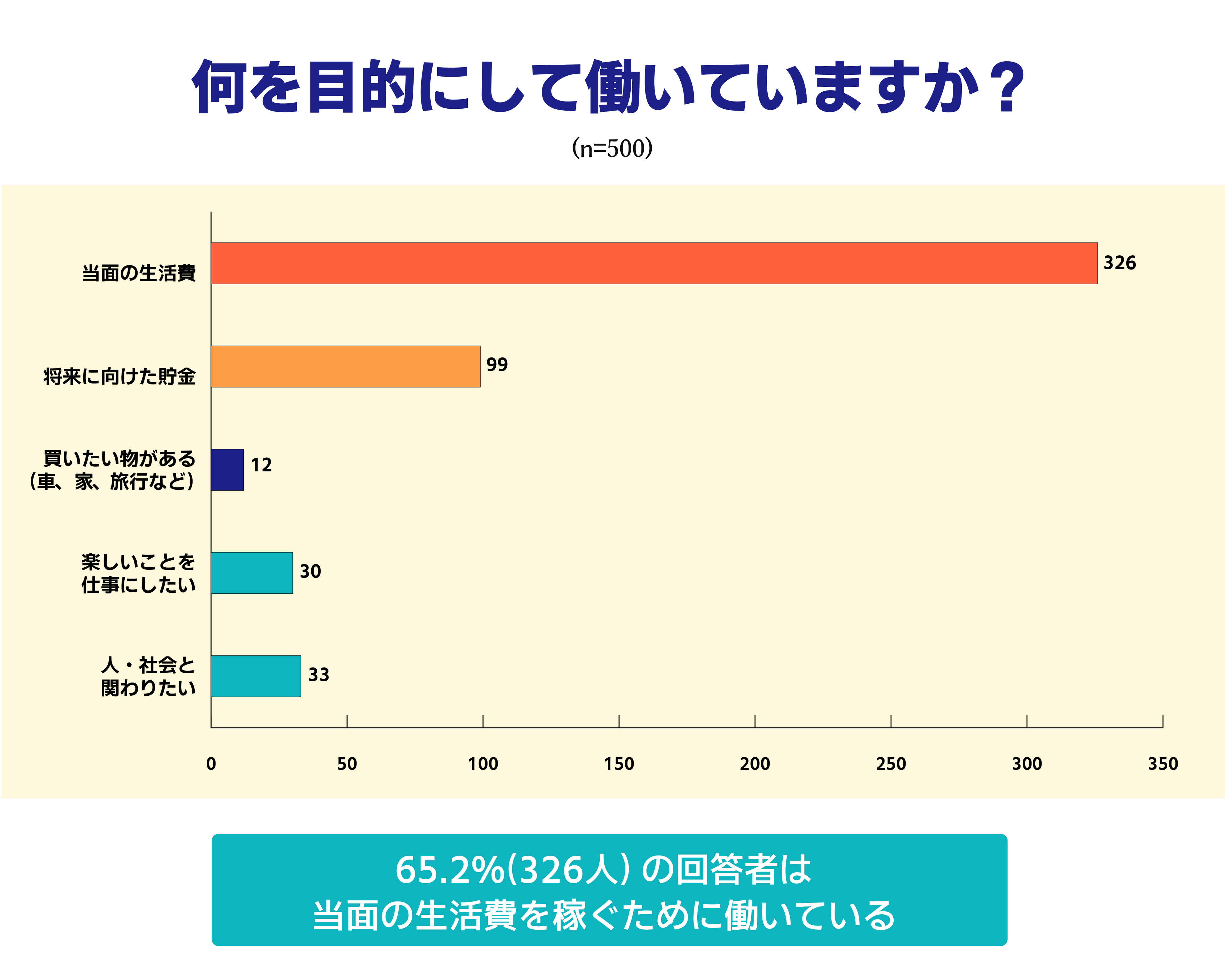 集計の結果、65.2%の回答者が「当面の生活費」を目的に働いていると答えました。