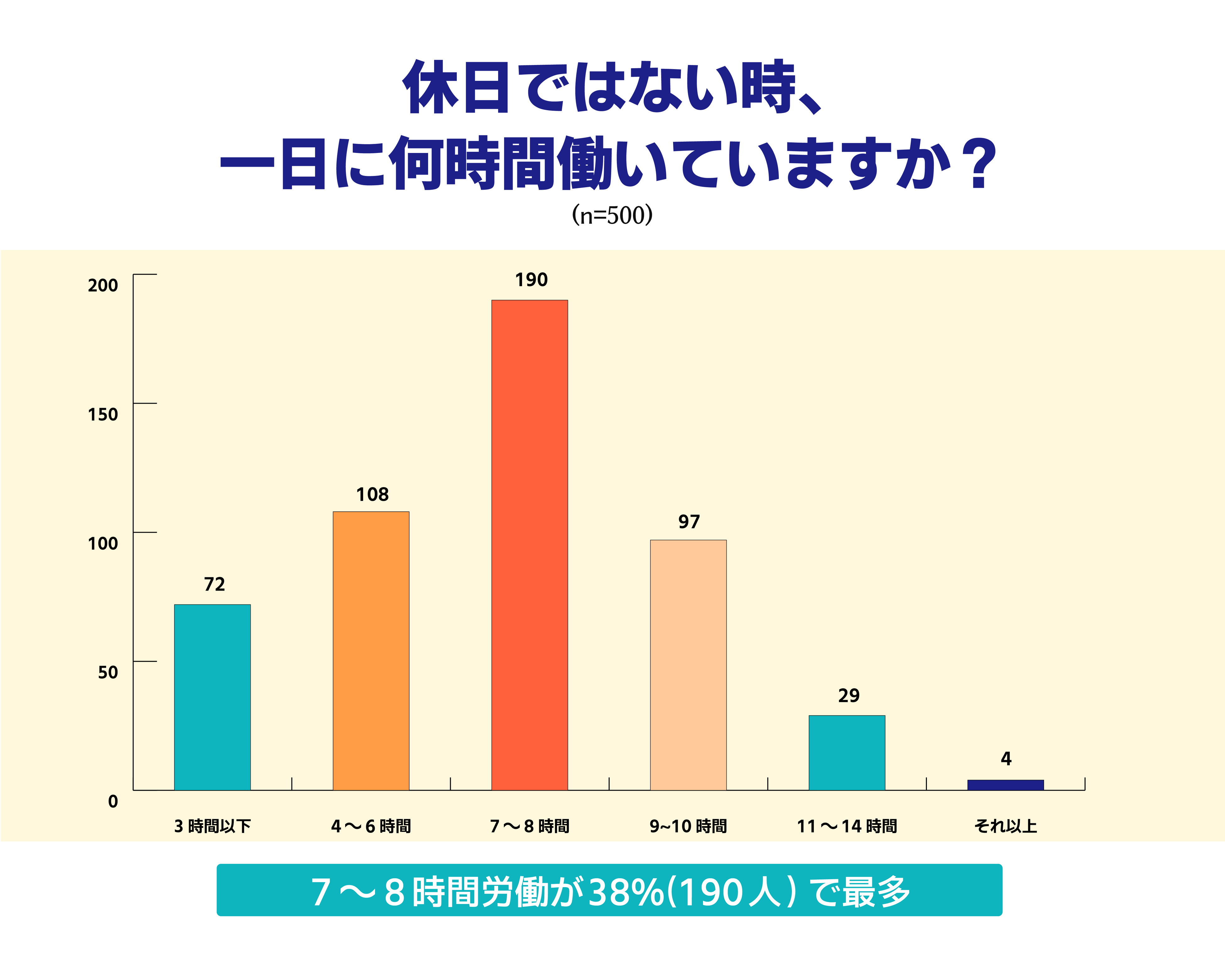 法定労働時間である8時間に近い労働をしているのは、全体の38%(190人)。