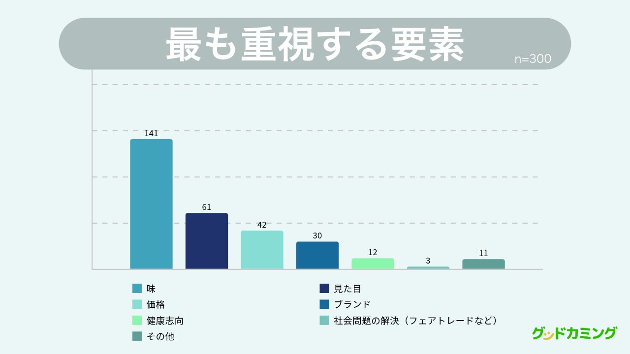 バレンタインに贈るチョコレート選びで最も重視するポイントについて尋ねたところ、「味」と回答した人が最も多く、47.0%(141人)を占めました。