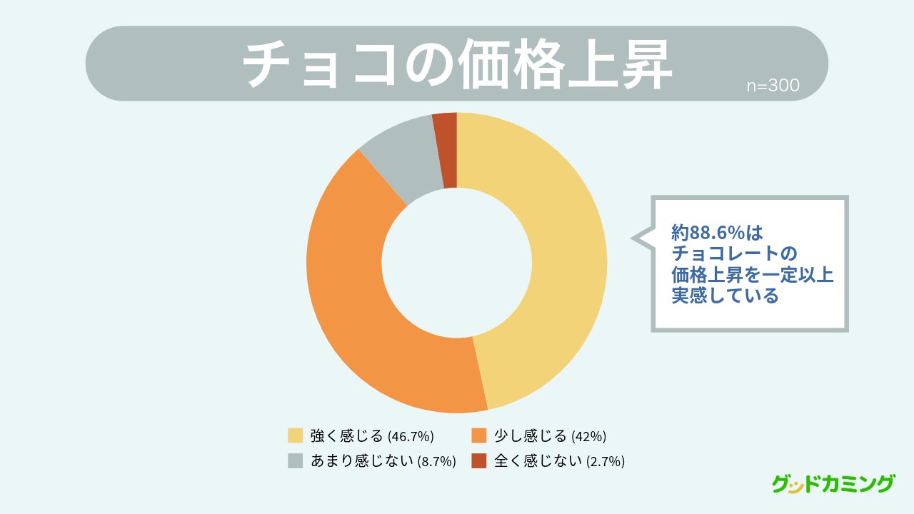 「チョコレートの価格が上がっていることを実感していますか?」という質問では、「強く感じる」と答えた人が46.7%(140人)。