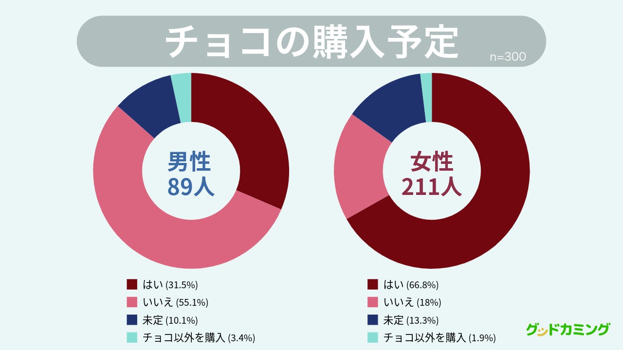 今回の調査では、回答者300人にバレンタインにチョコレートを購入する予定があるかを尋ねたところ、「はい」と答えたのは 169人(56.3%) でした。